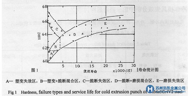 冷作模具鋼工作硬度對壽命的影響是綜合作用的結果,圖1所示為冷擠壓W6Mo5Cr4V2鋼沖頭(擠壓20Cr鋼)工作硬度與失效類型、使用壽命統計圖。
