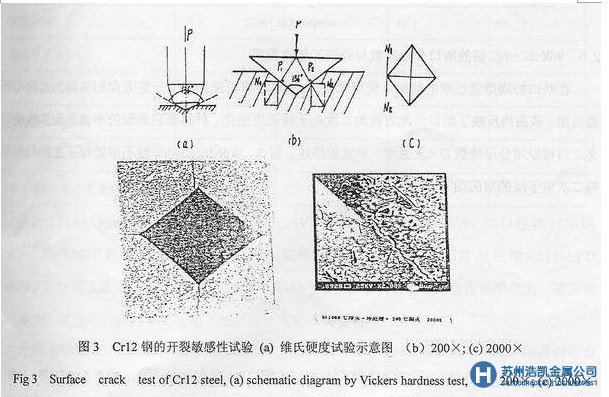 開裂檢測在布洛維硬度計上進行,先將試樣細磨機械拋光,用4%硝酸酒精溶液侵蝕適,用一個相對面間夾角為136º的金剛石正四棱錐體壓頭,在一定載荷下壓入被測金屬表面(圖3a)。在顯微鏡下觀測壓痕正方形邊界形態變化。每個試樣測3-5點。受力分析表明,只有當作用在邊界的應力大于材料局部區域開裂的門檻值時,就可能出現裂紋,從而可以判斷該材料的表面開裂敏感性。圖3b,c為Crl2鋼的開裂敏感性試驗結果和形貌。