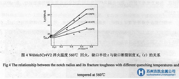 實驗表明,W6Mo5Cr4V2鋼缺口斷裂韌度隨缺口半徑r1/2呈線性遞增關系:K1(r)=K1(ro)+Yr1/2;淬火溫度上升,斷裂韌度K1(ro)下降,K1(r)-r1/2曲線斜率亦從Y=491下降到173。斜率變化不同表明,低溫斜率Y值高于高溫狀態,說明低溫淬火更有利于提高材料抗應力集中的能力。