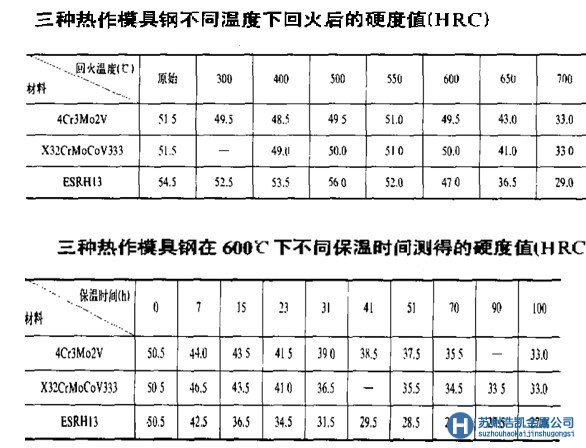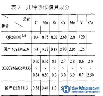 根據高速熱模鍛時的工作條件,選用了X32CrMoCoV333鋼、ES R  H13鋼和4Cr3MO2 V鋼,在實驗室條件下,進行了抗回火,抗長時間高溫軟化和耐熱疲勞性能的比 較 這些熱作模具鋼成分見表2: