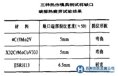 ( 3 ) 缺口端部的耐熱疲勞性能將試樣線切割成30度V形缺口 缺口頂點處半徑為0.075mm,將試樣表面拋光后,由室溫放入750℃±10℃的鹽浴中保溫一分鐘,然后取出水冷到室溫,再加熱和水冷,如此反復10次,其結果見表 5。由表5可以看出,在試樣有缺口的條件下。4Cr3Mo2V鋼缺口部位的耐熱疲勞性能和X32CrMoCoV333鋼的相近,比ES RH13 鋼的要好。這說明4CrMo2V鋼模具更適應于模鍛過程中不斷水冷的工作條件。