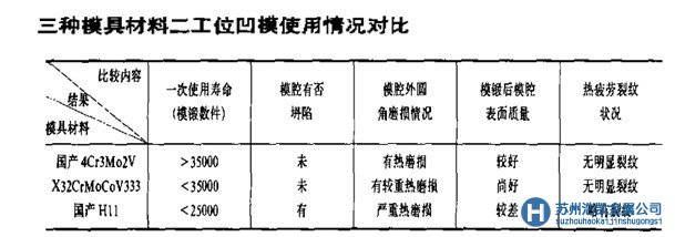 一般熱鍛模的失效形式是模腔在高溫和力的作用下,模腔輪廓幾何形狀變化或局部坍塌因模腔表面,特別是模腔過渡外圓角部位受鏹坯金屬劇烈流動而造成嚴重磨損以及模腔在模鍛時溫度急劇變化而形 成熱疲勞裂紋等等。對用上述三種材料制作的工位凹模的使用情況進行了對比,其對比情況列于表6。