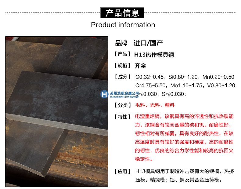 常用模具鋼性能用途、密度硬度和化學成分: 蘇州浩凱金屬材料有限公司大量銷售H13鋼板,提供H13鋼板價格新報價,關于H13鋼板的技術參數及H13鋼板性能_H13鋼板密度_H13鋼板材料材質_H13鋼板規格型號_H13鋼板熱處理技巧等可以在線咨詢我們官網的在線客服。H13鋼板的化學組成元素與含量,亦可以咨詢我們。想了解更多H13鋼板用途的朋友可以在線咨詢我們的客服,我們竭誠為你提供優質的服務。 H13模具鋼簡介 H13是熱作模具鋼